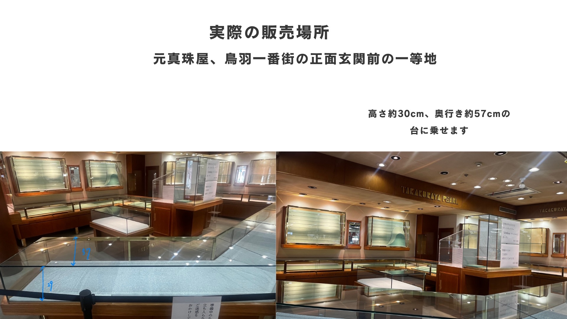 高級感のある旧真珠店の什器を最大限に活かし、油絵、水彩画、陶芸作品の実物(リアル)を展示いたします。
