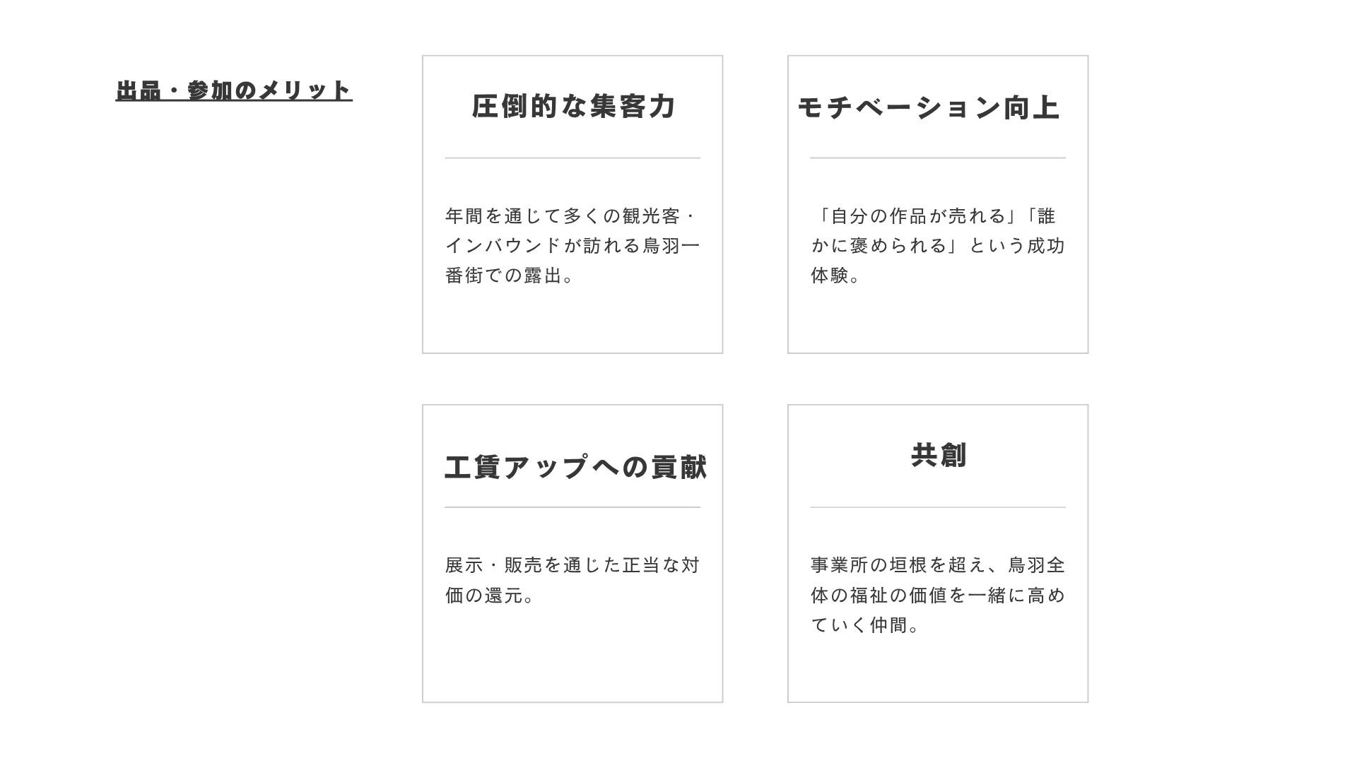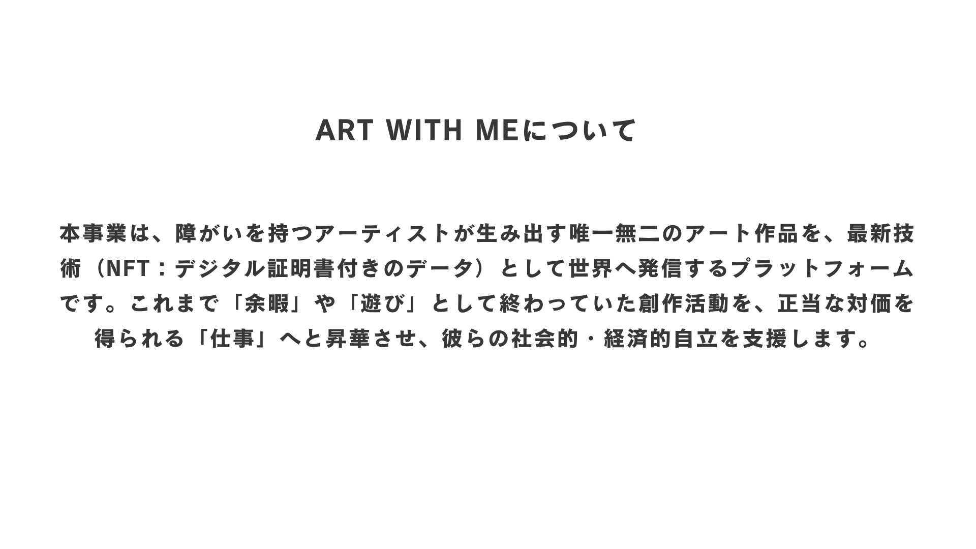 これまで「余暇」や「遊び」として終わっていた創作活動を、正当な対価を得られる「仕事」へと昇華させ、彼らの社会的・経済的自立を支援します!